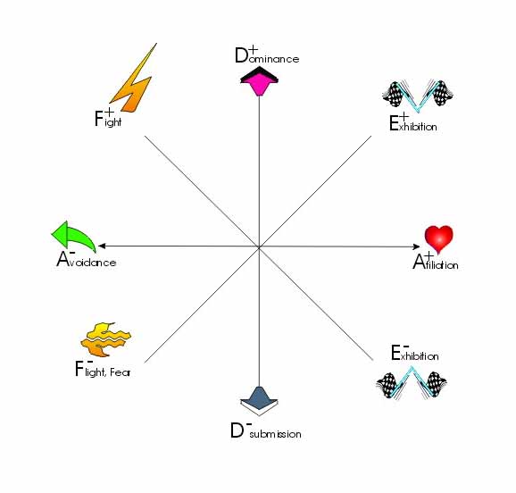 Hypothesis testing: the musical circumplexIn the first experiments, Leary's [5] circumplex with its eight tendencies was used. But soon, listening to music and inspired by ethology (e.g., I missed flight, fear), I changed it. The circumplex (Table and Picture) has a horizontal (afiliation-avoidance) and a vertical (dominance-submission) axes . The tendencies are: